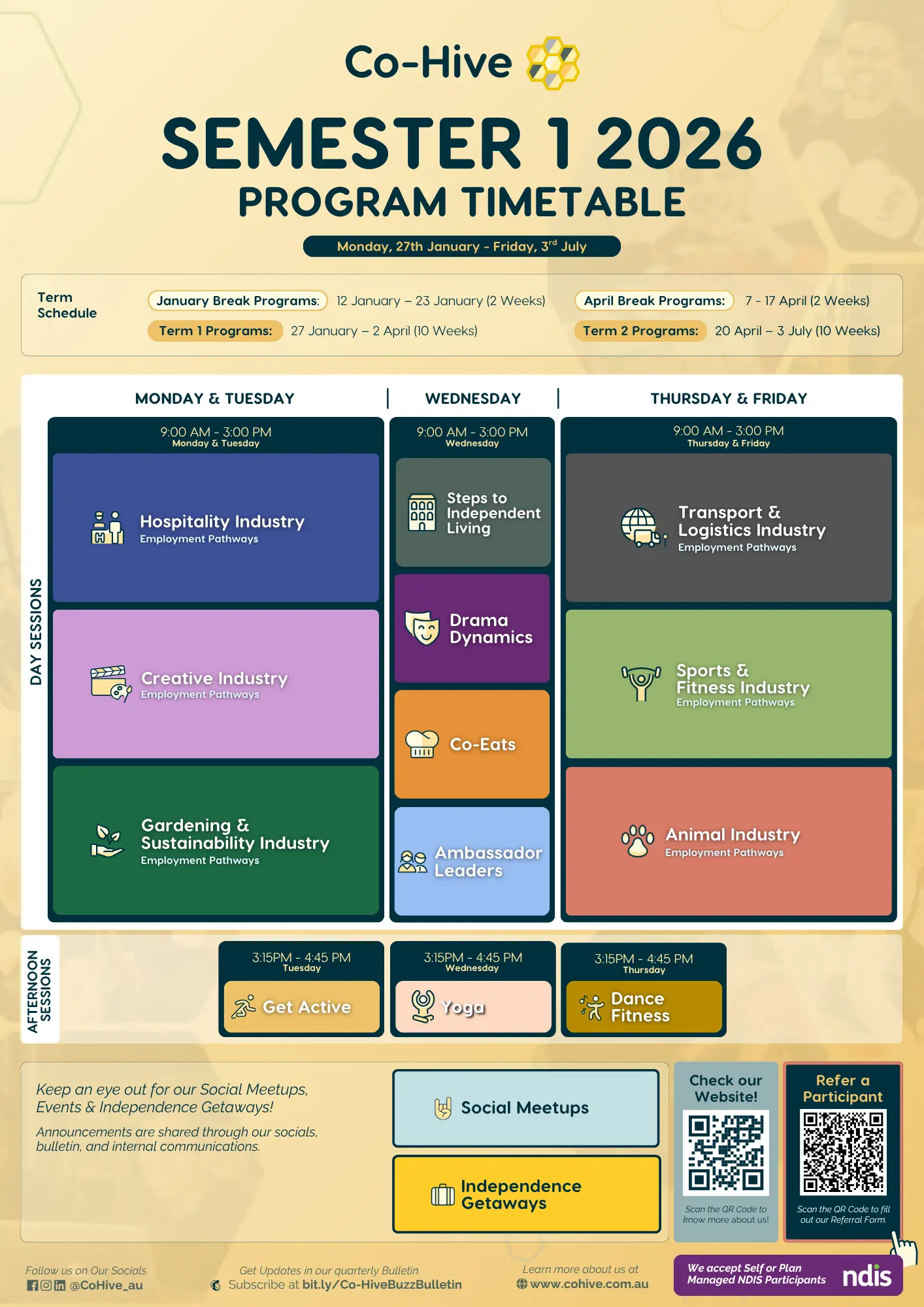 Co-Hive was founded by Kim, who recognised the need for a supportive space for young people with disability transitioning from school—or, in some cases, not completing school. Many of these individuals had the potential to live successful, independent lives but lacked opportunities to build the necessary skills, make choices about their future, and feel part of a community.Co-Hive was created to empower, support, and connect participants on their journey to independence.
