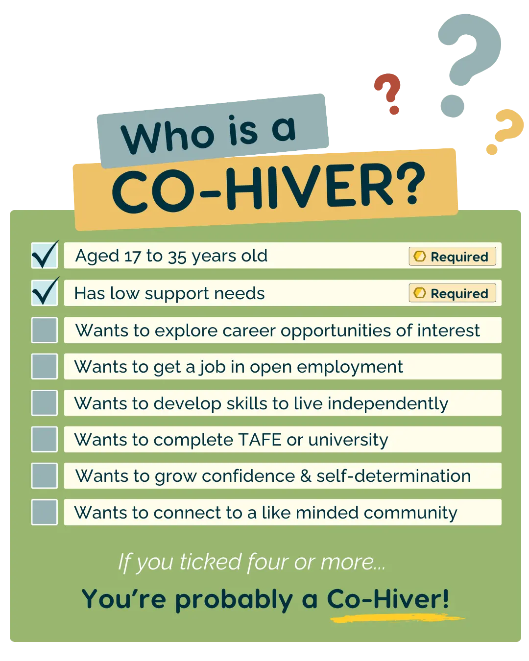 A Co-Hiver is a young adult with disability or neurodivergence who is ready to take their next steps towards adulthood.