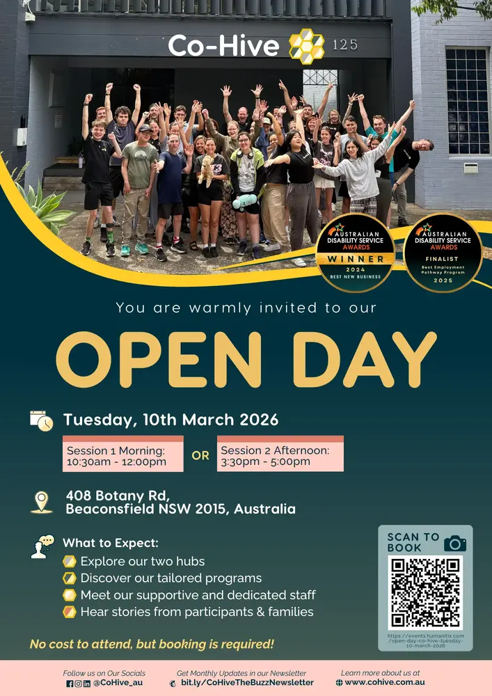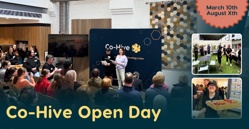 Co-Hive is a Sydney-based organisation empowering young adults aged 17 to 35 with disability, neurodiversity, and low-support needs to achieve award-wage open employment, build independence and advocacy, and develop social connections.